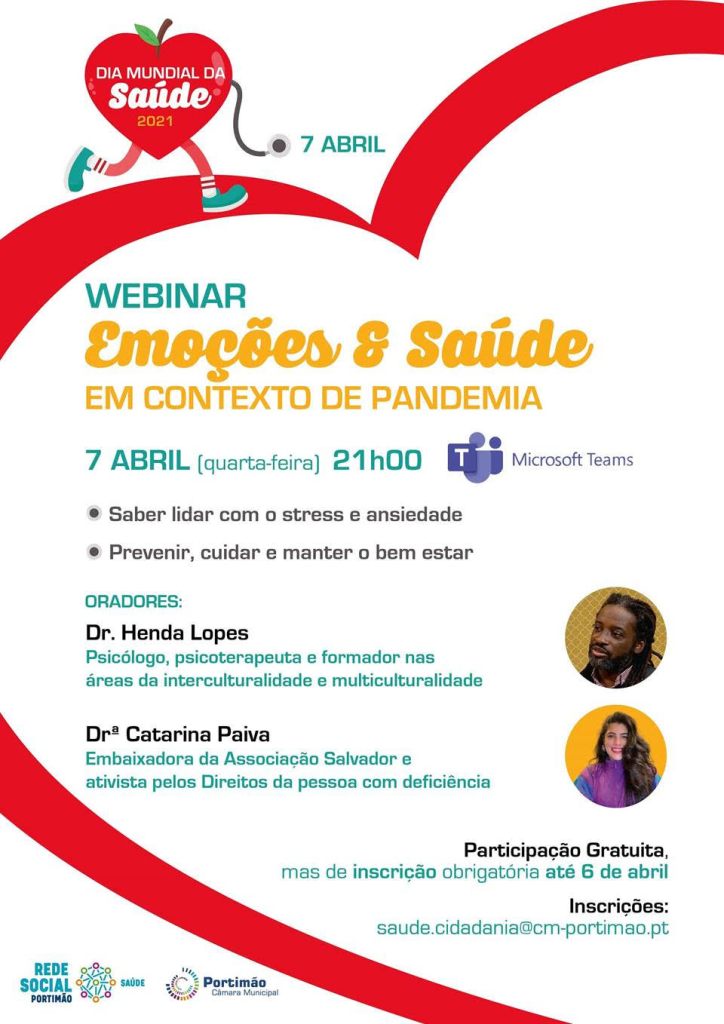 No Dia Mundial da Saúde, 7 de abril, participe no Webinar “Emoções & Saúde em Tempos de Pandemia” onde vamos falar de emoções e saúde psicológica e ajudá-lo(a) não só a saber lidar melhor com o stress, ansiedade e situações de depressão, como também a prevenir, cuidar e manter o seu bem estar .