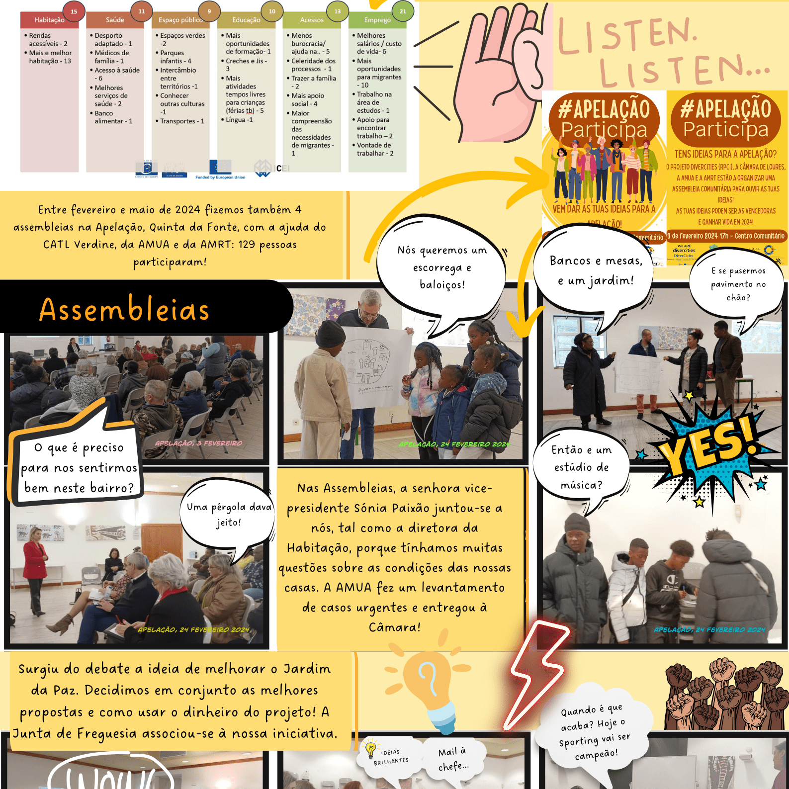 Organização e realização de 4 Assembleias Comunitárias Participativas na Apelação, Loures, com presença de de 129 pessoas, como apoio de duas associações de base local – AMUA e AMRT;