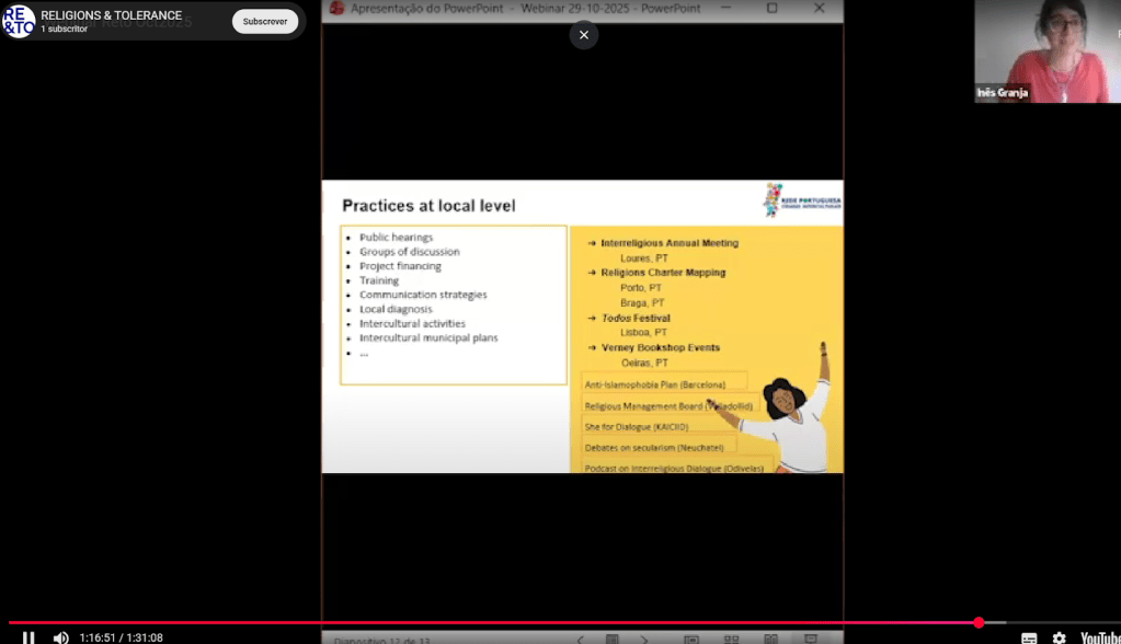 Sessão 2:“Rede Portuguesa de Cidades Interculturais: exploração da ligação entre a interculturalidade e a diversidade religiosa na governação local” Oradora:Inês Granja, coordenadora de projetos da Rede Portuguesa de Cidades Interculturais (RPCI).