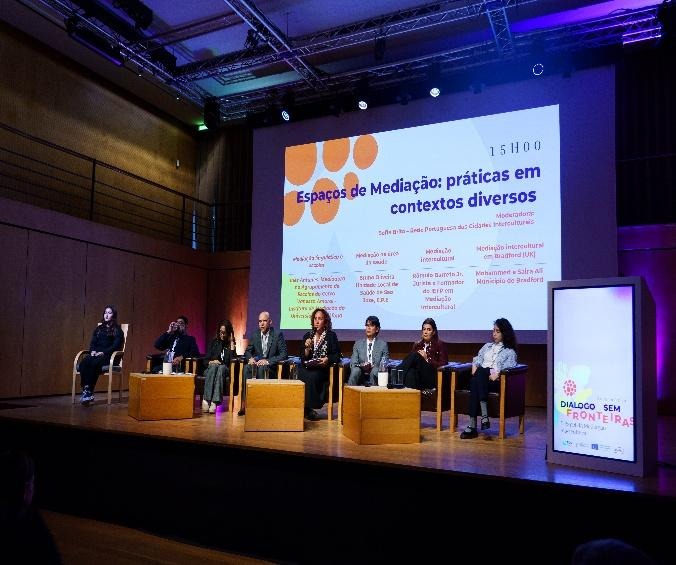 A Rede Portuguesa de Cidades Interculturais (RPCI) moderou o painel da tarde sobre diferentes Espaços de Mediação onde se destacou o trabalho que é desenvolvido na promoção da interculturalidade ao nível local, apresentando projetos de mediação que facilitam a integração de comunidades migrantes, reforçam o diálogo entre culturas e reduzem barreiras linguísticas, sociais e institucionais. Esta prática em contextos diversos permitiu partilhar experiências no âmbito da mediação linguística e escolar; Mediação na área da saúde; Mediação intercultural e inclusive teve a participação internacional de um projeto de mediação intercultural em Bradford (UK).