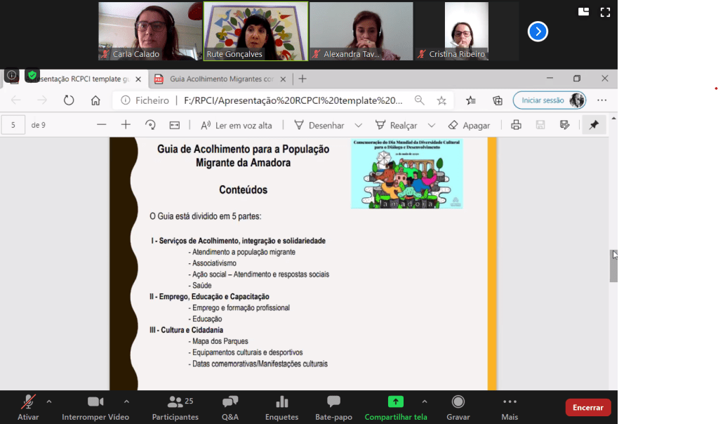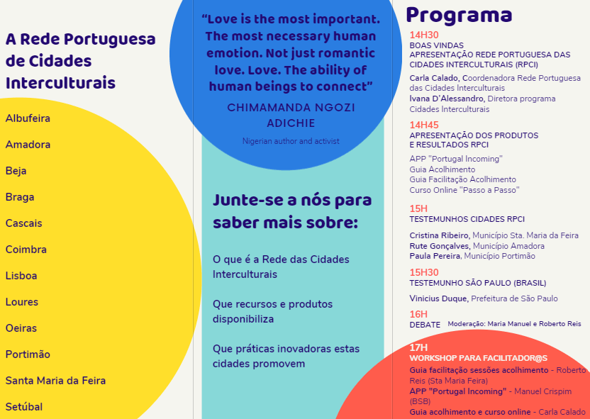 No passado dia 2 de dezembro 2020, a Rede Portuguesa das Cidades Interculturais organizou um webinar onde @s participantes puderam saber mais sobre a nossa Rede, inspirar-se com os testemunhos das cidades que a compõem, nomeadamente do Amadora Município, Município de Santa Maria da Feira e Município de Portimão, conhecer o nosso convidado da Câmara Municipal de São Paulo e ficar a conhecer os nossos produtos.